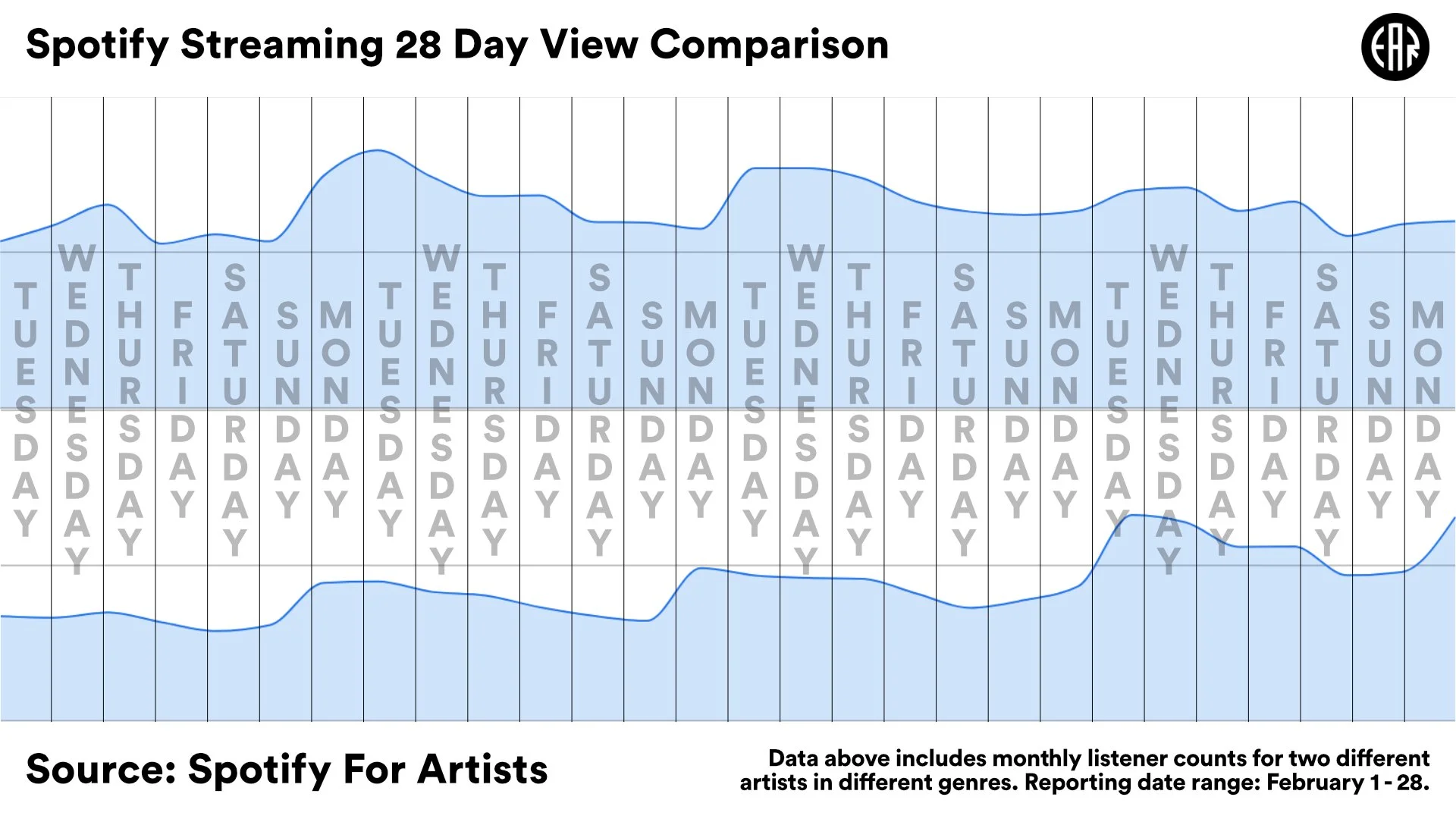 For many of the artists we manage, a common trend starts to emerge with an increase in listeners and streams. No matter the artist or genre, a consistent dip occurs during the “weekend” days. For example, say you release a song and it’s added to a bunch of listener libraries/playlists, and continues to grow over the next few weeks. Consistently, we see a rise and fall of this progression starting on Monday, increasing up to Thursday, and then a drop on Friday to Sunday. No matter the week, this wave-like pattern follows the routine rhythm of weekly work schedules.