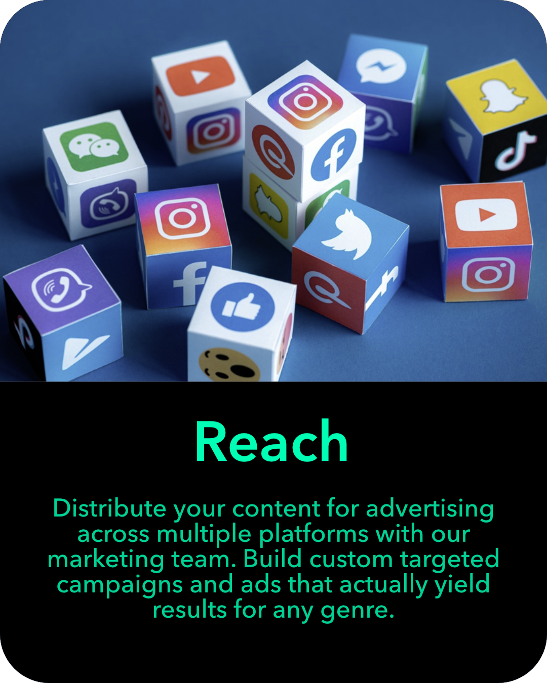 Once we have a better idea of where your music will fit in the music industry, we will push your material and train you to expand outside your comfort zone. From commercials to feature requests, unorthodox opportunities and more, our plan will consistently push you via many forms of media and entertainment.